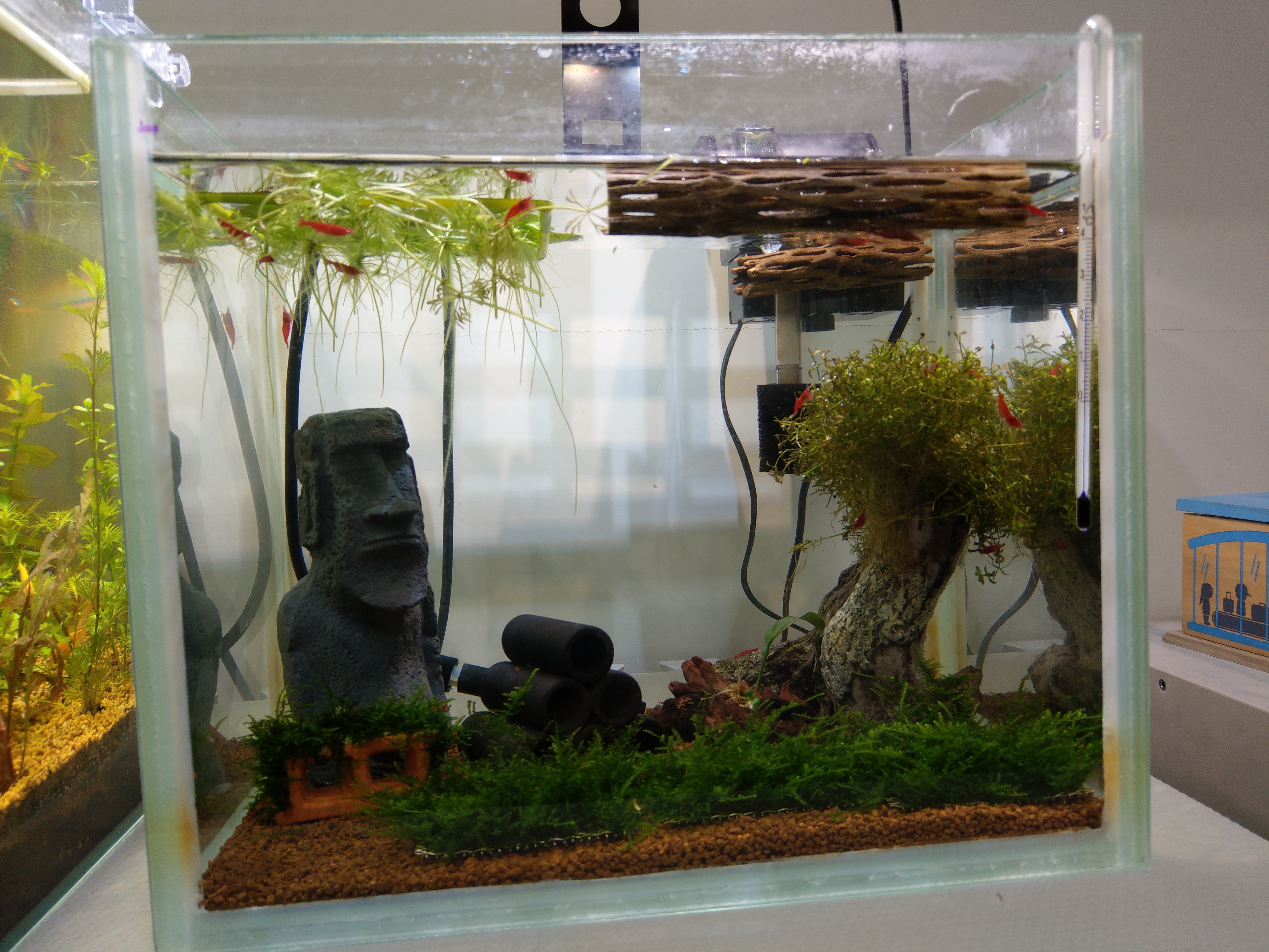 左後方新增火花百葉,而前中的珍珠草被我移到右後方,前中改種迷你矮,右前則新增聖甲蟲。而蝦缸多了一顆金城武樹(雖然我不知道他為什麼叫這名稱)以及兩根蛇木,變得十分豐富。